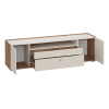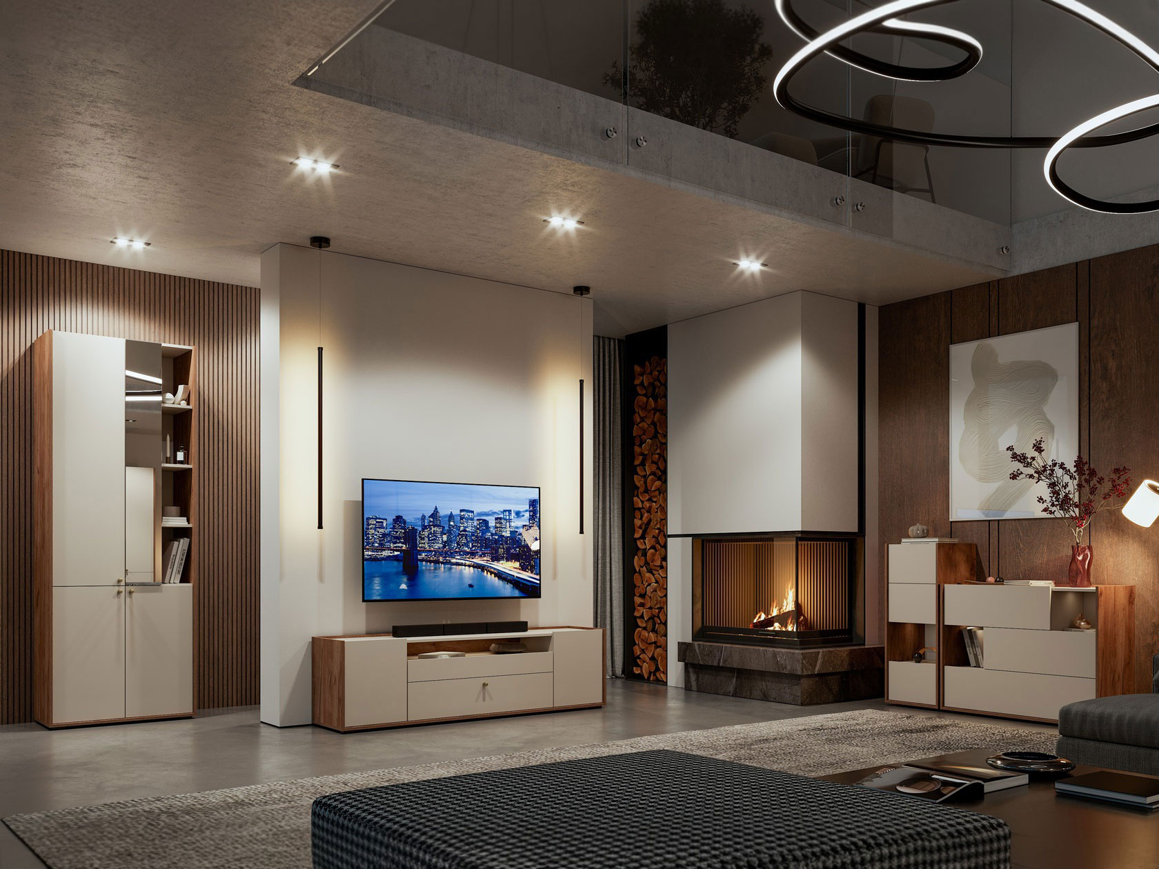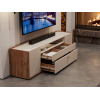 Разноплановые отделения помогут хранить зарядные устройства, пульты и прочие аксессуары. Мягкий древесный оттенок в сочетании с матовыми фасадами добавит обстановке уютный акцент.