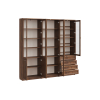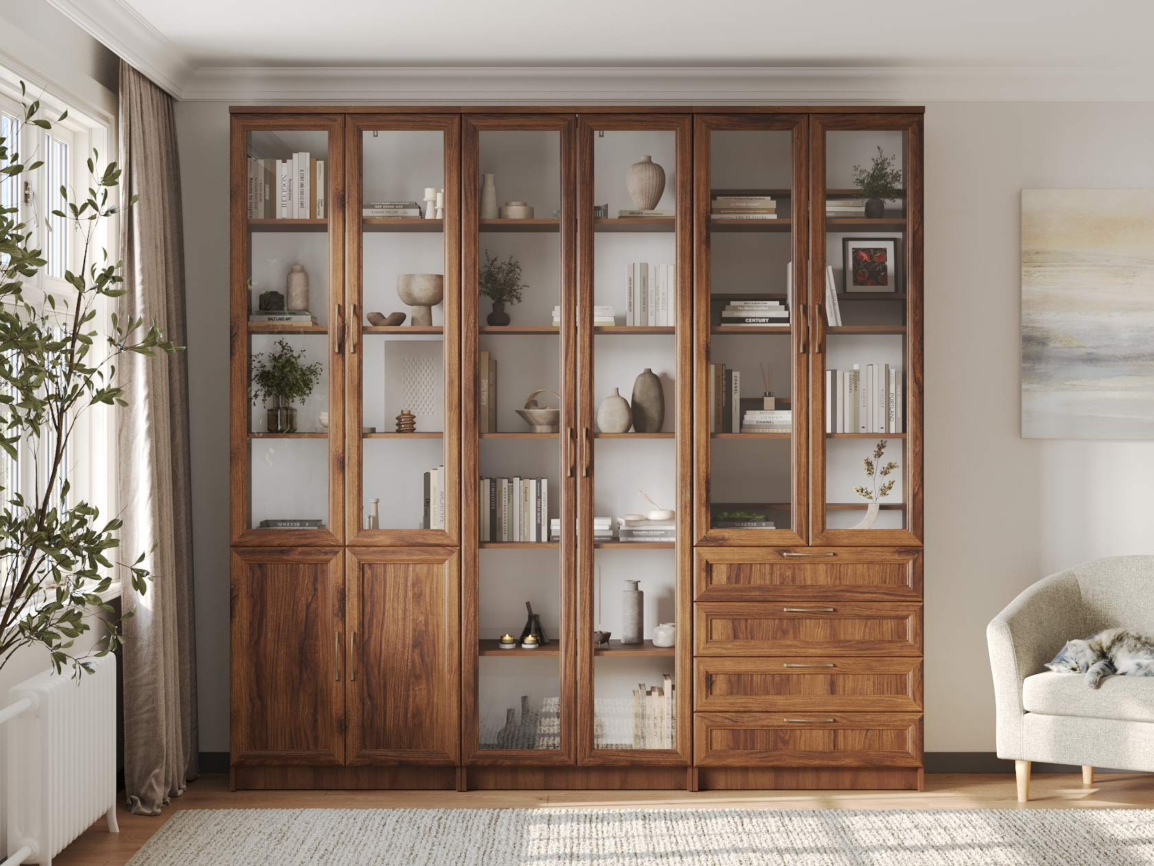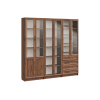 Витрины и глухие дверцы защищают содержимое от пыли и воздействия солнечных лучей. Рамочные фасады с изящными ручками гармонично сочетаются с классическим стилем меблировки. Доводчики и направляющие с плавным ходом обеспечивают комфортную эксплуатацию.